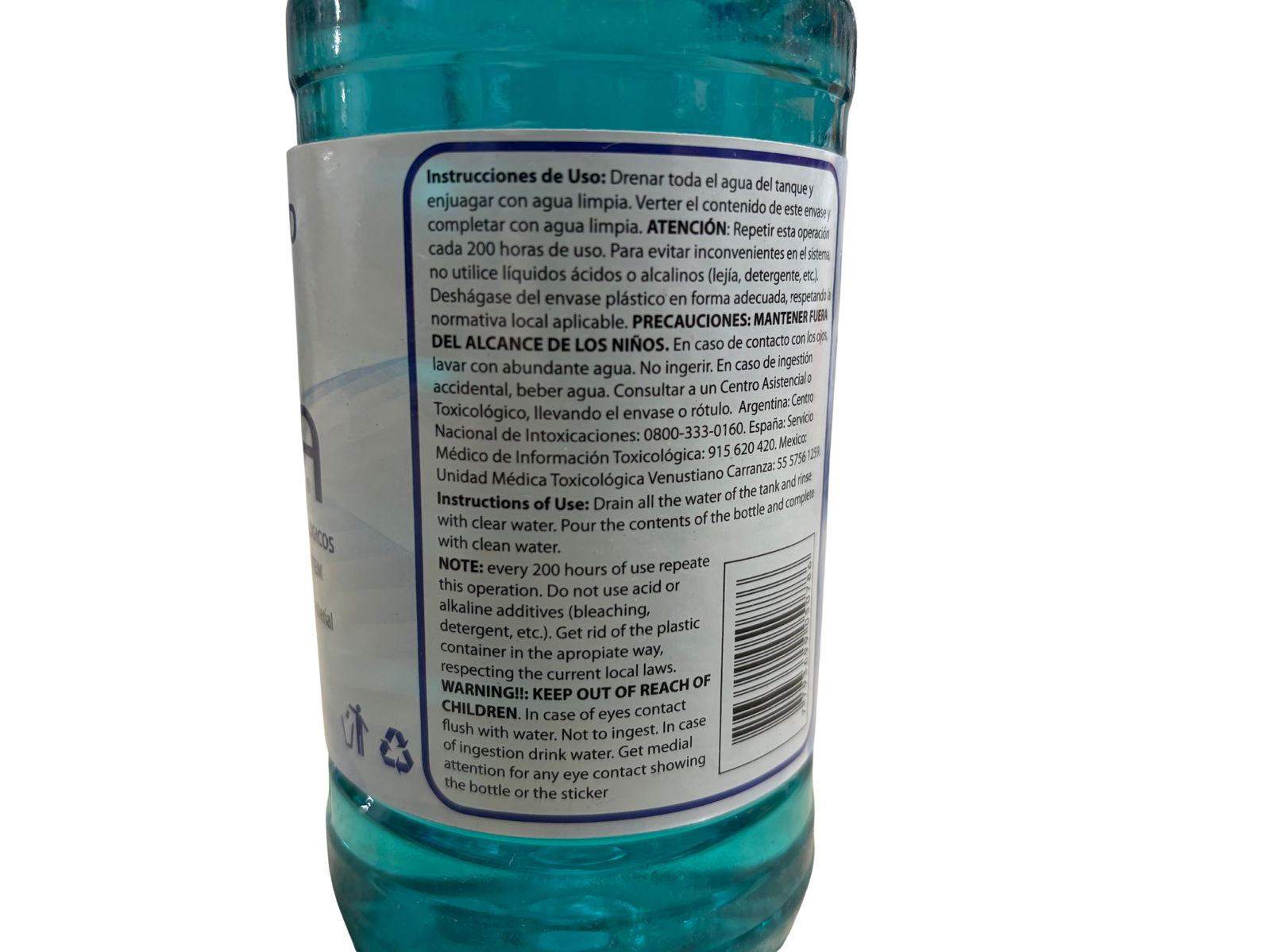 Instructions of use: Drain all the water of the tank and rinse with clear water. Pour contents of bottle and complete with clean water.